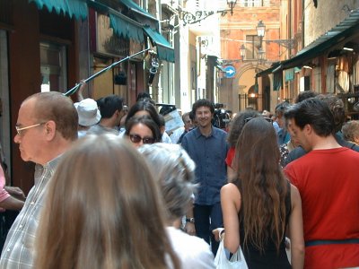 The guy in the middle in the blue shirt is Fabio Fazio. He has